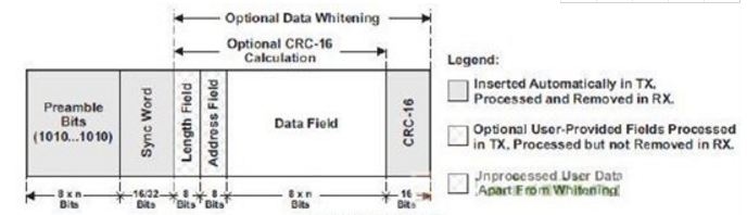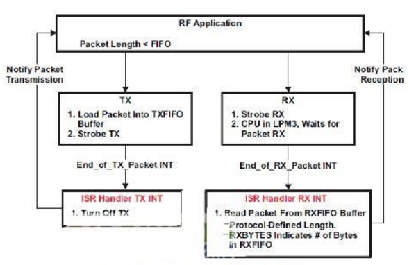 在接收时,RF 的解调器和数据包处理器将寻找一个有效的前导和同步字。当找到后,解调器将获得前导位和字同步,然后对接收的地址信息进行比照,首先判断数据包是否来自控制端,然后响应含有广播地址或者本机地址信息的数据。其发射/接收的流程图如图。