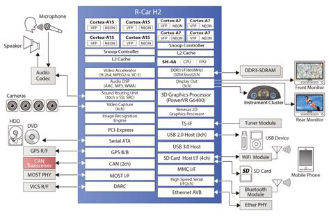 2015年以后的高端汽车信息系统将要求高清晰度显示器,仪表组合,多显示器输出到后座监视器,专门针对汽车的用户体验,改进的响应性以及使用大数据的云服务。 另外,对于这些嵌入式设备的豪华性,高品质设计的快速启动能力和渲染性能将会有强烈的需求,以及为驾驶者建立更高的视野支持。 安全级别,例如不仅显示车辆的后部,而且显示在车辆周围的顶视图监视器。 为了应对这些要求,从现有的R-Car H1SoC继续高端汽车信息系统,瑞萨正在发布 第二代R-Car,R-Car H2,性能大幅提升。