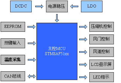 2、信号采集:外部传感器实时采集车内车外温度,传给控制器;