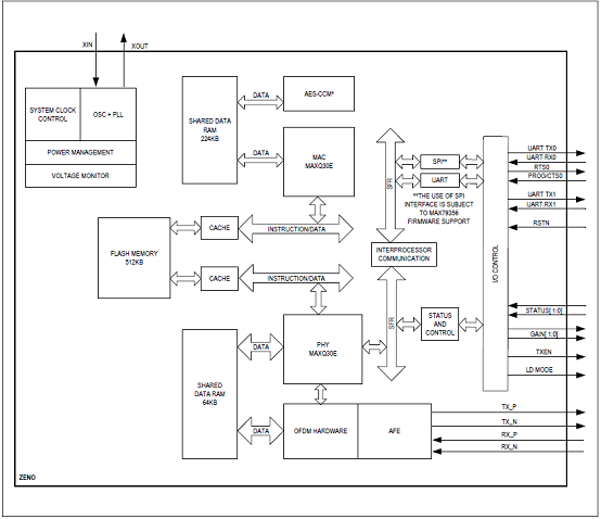 ZENO™ (MAX79356) is a programmable narrowband orthogonal frequency division multiplexing (OFDM)-based powerline communication (PLC) modem system-on-chip (SoC) device that provides standards compliant high performance and secured powerline communication in a small package. ZENO integrates two pipelined 32-bit RISC (MAXQ®30E) processors to offer high performance and future-proof flexibility. These two 32-bit RISC processors perform dedicated PHY signal processing functions and MAC layer functionality. Maxim provided, certified firmware images allow faster time to market. Factory or in-field firmware update feature allows adoption of changes and updates in PLC communication standards. The integrated high-speed AES-CCM* engine ensures standards compliant data communication security and integrity. MAX79356主要优势和特性: