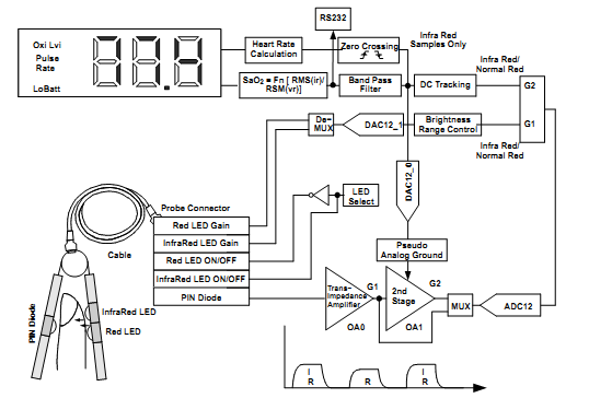 指式脉搏血氧仪方案,采用MSP430作为主控芯片,具有功耗低,模拟集成度高等优点,该DEMO对人体动脉血氧饱和度和心率进行测量,并显示在LCD上,数据波形可通过UART在PC机上显示。