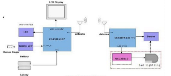 手持式遥控模块,其基于CC430F6137,带有段式LCD 驱动,丰富的I/O 口资源,以及能够构建触摸功能的比较器;而接收端则基于CC430F5137,其带有12-Bit 的 ADC 以及多通道的PWM 模块。通过在控制端CC430F6137 的比较器B 上构建触摸滑条与按键功能,对滑条的触摸位置进行检测并转换为PWM的占空比,通过双边的RF 模块发送/接收相应的调制参数,再由接收端CC430F5137 产生调节LED 灯亮度的PWM信号,对驱动模块UCC28810 进行调制。